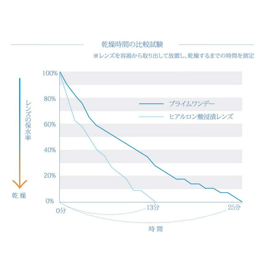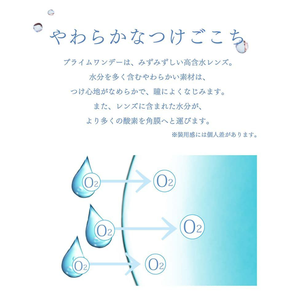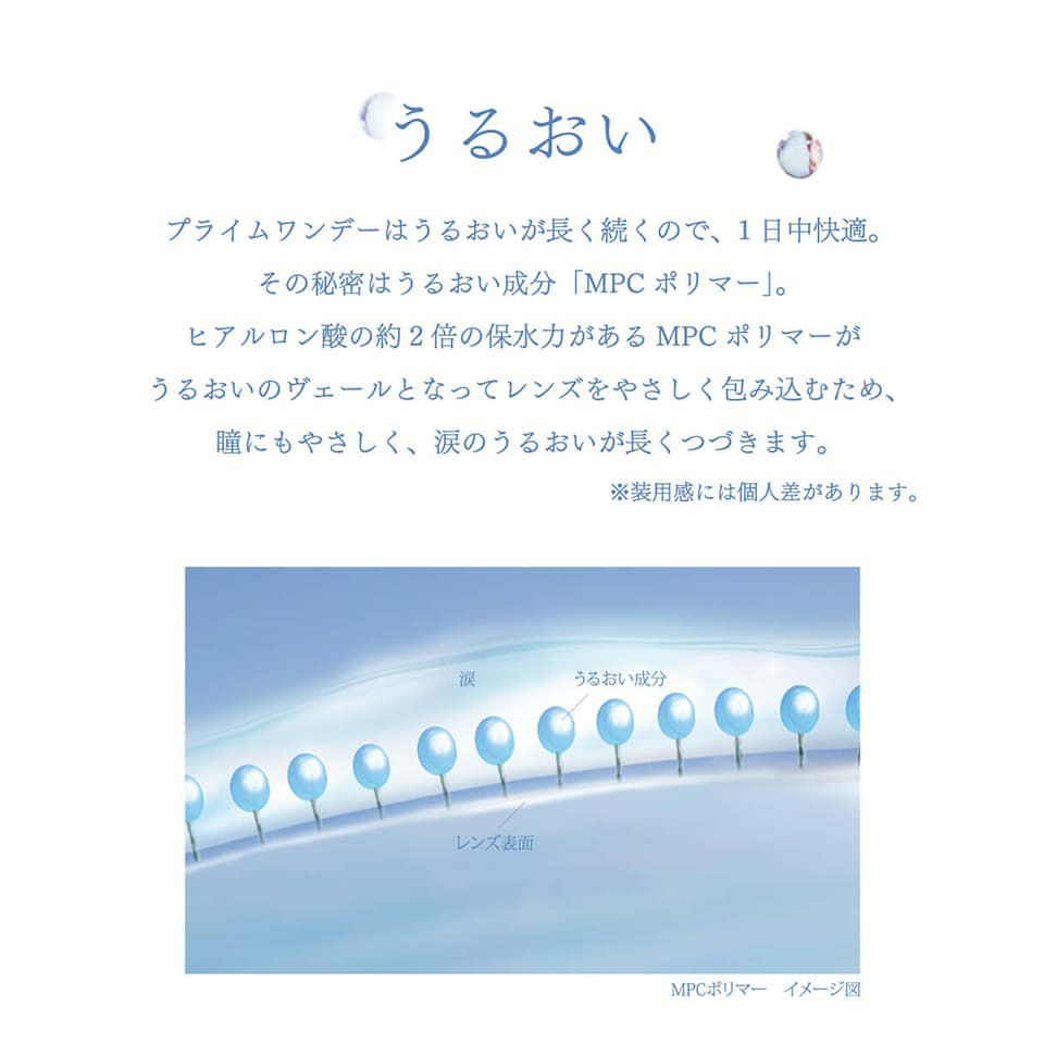 プライムワンデーは、従来品の2倍の保水力があるので、1日中快適。その秘密は「うるおい成分MPCポリマー」。潤いのヴェールとなってレンズをやさしく包み込むため、瞳にもやさしく、涙のうるおいが長くつづきます。瞳の乾きによるゴロゴロした違和感を感じることなく、一日中快適にご使用いただけます。