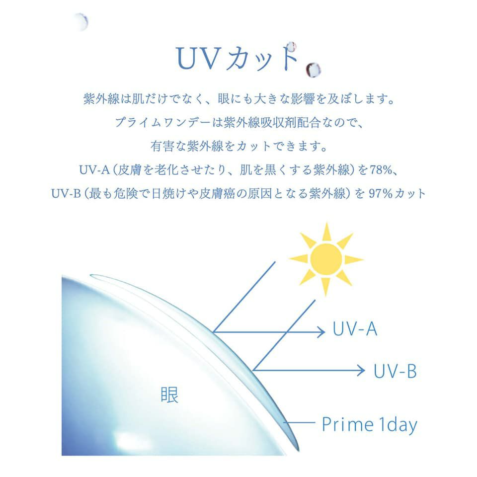 プライムワンデー(Prime1day)は価格が1,000円代の低価格ワンデーコンタクトレンズ。UVカット付き+うるおい+高含水58%の高品質の1日使い捨てコンタクトレンズ!