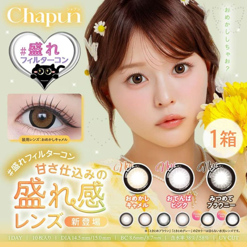 ※新色「おめかしキャメル」「おてんばピンク」「みつめてブラウニー」は含水率38%、既存色は58%となります。レンズスペックが異なりますので、ご注意ください。