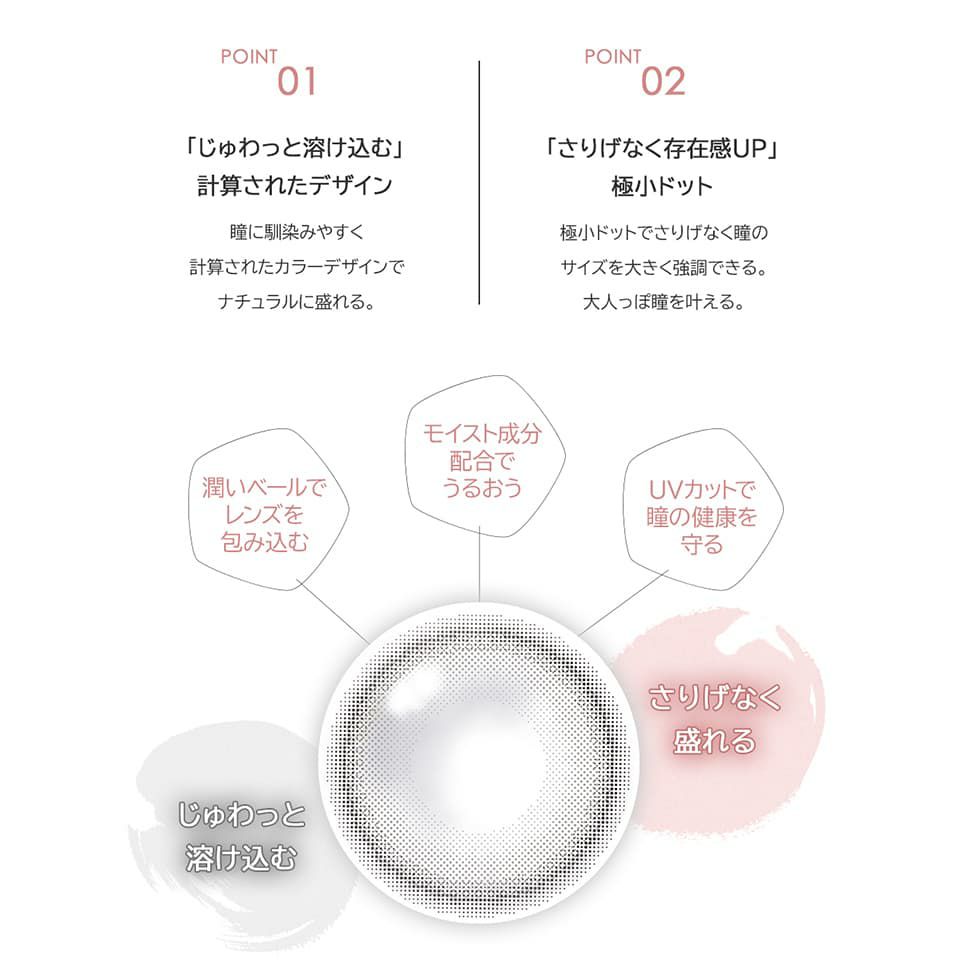 カラーはアクセントブラック(黒)とヴィヴィッドブラウン(茶)。自然でナチュラルな発色で、学校やオフィスでも使えるカラコンです。