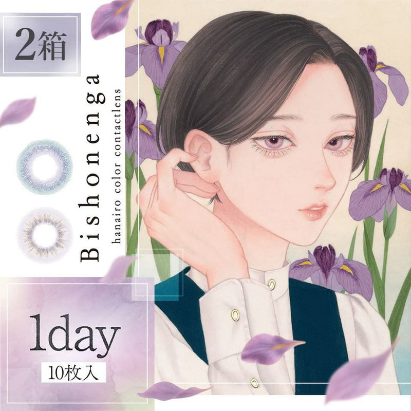 Bishonenga hanairoシリーズは画家"mumei"が描く「花×美少年」の世界観を日常に纏うためのカラコン。日本画のやわらかな色と陰影をヒントに、派手すぎない透明感の発色で瞳にニュアンスを添えます。推し活やイベント時にはもちろん、人とは違う、いつもとは違う色に挑戦したい方にもおすすめのカラコンです。