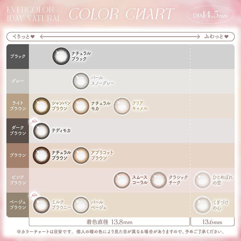 エバーカラーワンデーナチュラルは、あふれるほどの輝きを瞳に。 ほんのりさり気なく、こっそりオシャレな瞳に。トレンドを抑えたニュアンスカラーで「美しくなりたい」そんな願いを手軽に叶えてくれるカラコンです。 バレずに盛れるを追求したエバーカラーワンデーナチュラルのレンズサイズはDIA(直径)14.5mmで着色直径は13.6mm/13.8mm。盛りまくれるのに、ナチュラルで大人かわいい瞳になれる、自然なカラコン♪