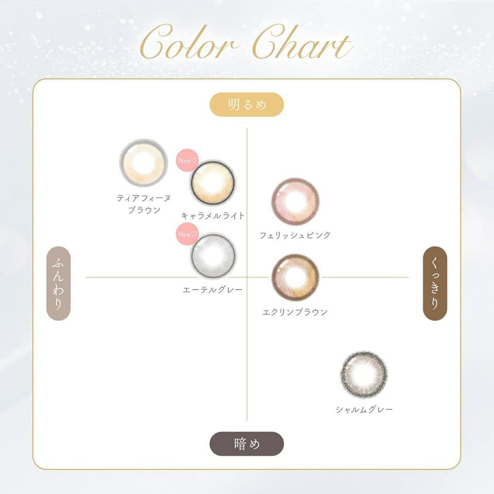 | 着色直径 | 【12.3mm】ティアフィーヌブラウン 【12.7mm】シャルムグレー 【13.3㎜】エーテルグレー / キャラメルライト / フェリッシュピンク / エクリンブラウン |