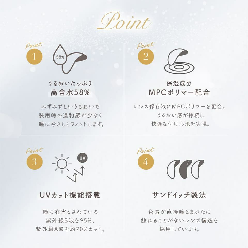 UVカット機能&保湿成分(MPC ポリマー)配合の高含水(含水率58%)カラコン。1箱10枚入(1日交換/ワンデータイプ)で、毎日瞳を清潔に保てます。