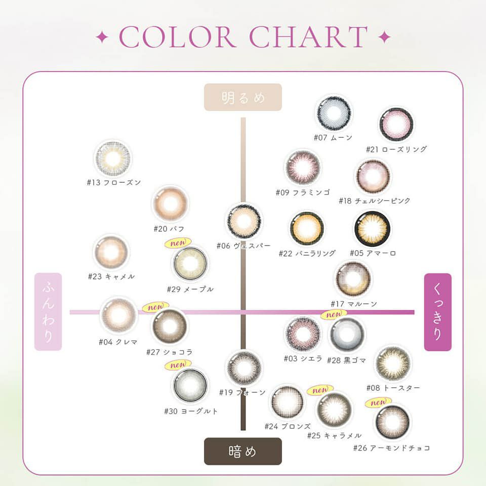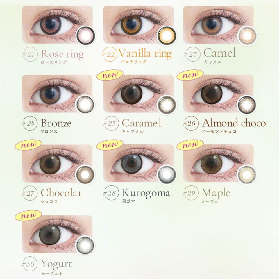 『ジェニッシュ(GENISH)』の新色 #25.Caramel (キャラメル) / #26.Almondchoco (アーモンドチョコ) / #27.Chocolat (ショコラ) / #28.Kurogoma (黒ゴマ) / #29.Maple (メープル) / #30.Yogurt (ヨーグルト)は、太フチ・細フチ・ふわフチまで、フチにこだわったデザインで印象的な瞳に♡様々なシーンでお使いいただけるカラーコンタクトレンズです**