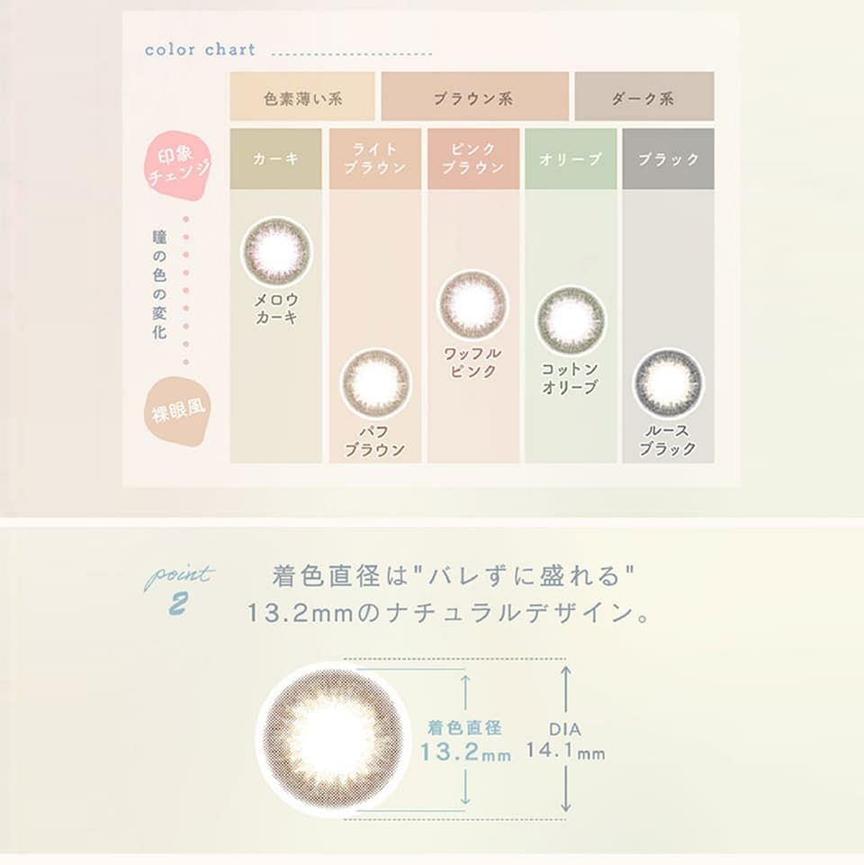 レンズカラーはダーク系の瞳に馴染みやすいブラウン系、ブラック系、オリーブ系の3色に、新色のピンクブラウン系、カーキ系が追加され、全5色に!またルミア(Lumia)ならではの”バレない”カラコンを目指し、着色直径は13.2mmと裸眼より一回り大きくなるサイズ感。UVカット機能付き。