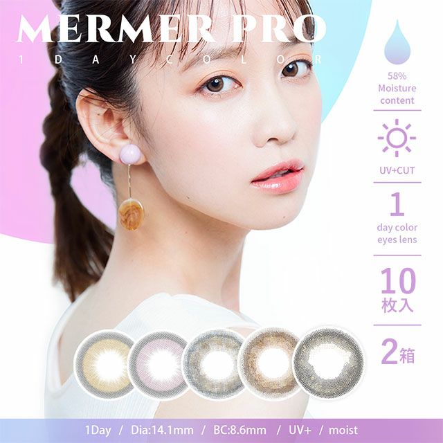 瞳を上品に輝かせ、いつもと違った印象になる5色展開。使いやすいブラウン&ブラックから、グレー系ハーフデザインまで!1日使い捨てタイプなので毎日清潔で、UVカット機能付き&含水率58%で1日中潤い続く。レンズサイズはDIA14.1mm、着色直径は13.0mm~13.3mmで瞳を一回り大きく魅せます。