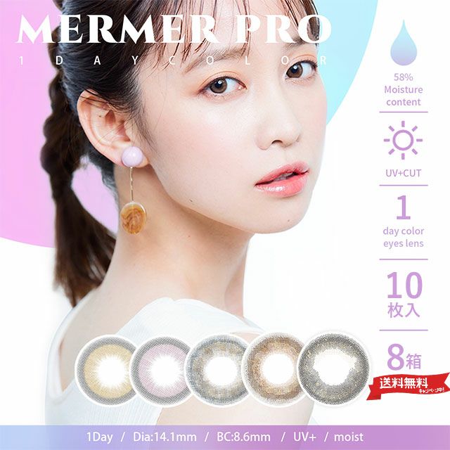 瞳を上品に輝かせ、いつもと違った印象になる5色展開。使いやすいブラウン&ブラックから、グレー系ハーフデザインまで!1日使い捨てタイプなので毎日清潔で、UVカット機能付き&含水率58%で1日中潤い続く。レンズサイズはDIA14.1mm、着色直径は13.0mm~13.3mmで瞳を一回り大きく魅せます。