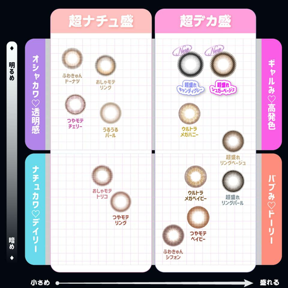 | カラー | 盛れキャンディグレー / 超盛れシュガーベージュ / 超盛れリングパール / 超盛れリングベージュ / ふわきゅんシフォン / ふわきゅんドーナツ / おしゃモテリング / おしゃモテトリコ / つやモテチェリー / つやモテリング / つやモテベイビー / ウルトラメガベイビー / ウルトラメガハニー / うるうるパール |