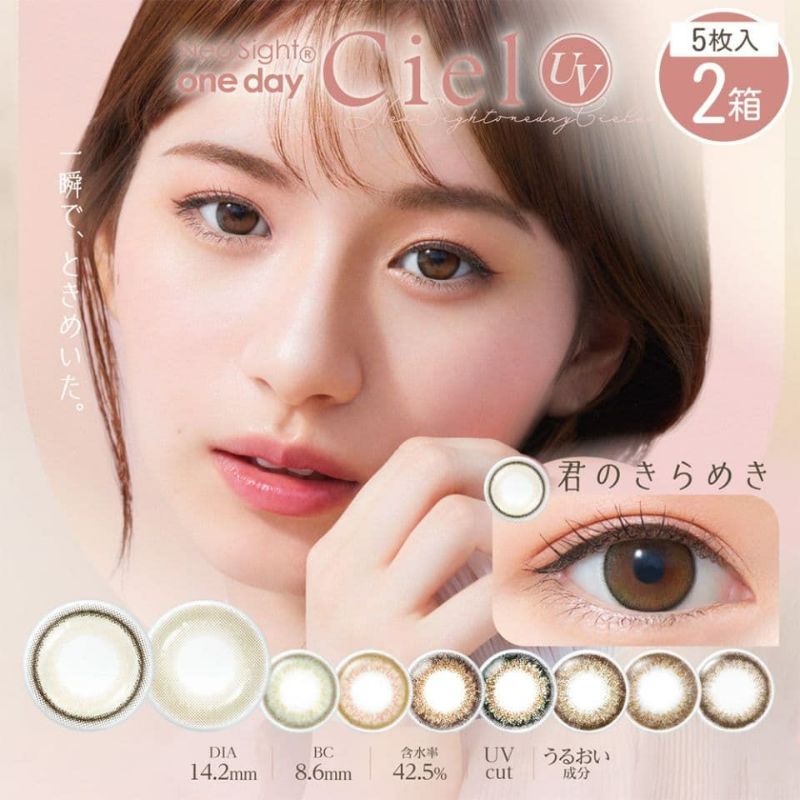 ネオサイトワンデーシエルUVに新色「となりのあの子」「君のきらめき」が追加!新色はレンズ全体にハイライトカラーを配色し、光が差し込んだ木漏れ日のようなデザインが特徴。ほわっと薄付きの透明感溢れるカラーで今っぽい瞳に♡。既存カラー7色を合わせた全9色のラインナップ。サークルレンズでもなくカラコンでもない、3トーンのナチュラルカラー。瞳に馴染むほどよい華やかさが女性らしさを引き立てます。レンズ直径(DIA)14.2mm、着色外径は自然に大きく見える13.6mm / 13.3mm。パーティーやデートなど、少し華やかに見せたい時はもちろん、大人のデイリー使いにぴったりなレンズです。