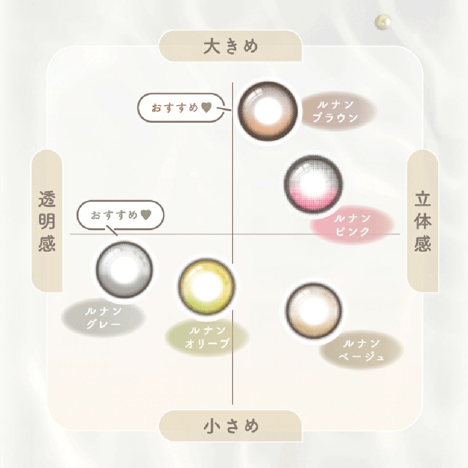 着色直径は13.1mm~14.2mmの裸眼を一回り大きく魅せる自然なサイズから、くりっと大きめの瞳に魅せるサイズまで幅広く取り揃えています◎