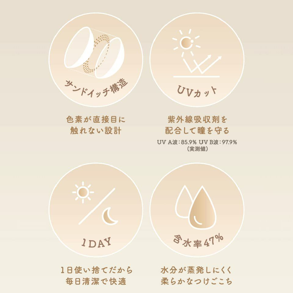 酸素透過率【187】 / UVカット機能 / 色素が瞳に触れないサンドイッチ構造 / 柔らかさと潤いをキープするモイストキャッチテック構造 / 潤い成分(MPCポリマー)配合でデザインだけでなく、瞳に優しい毎日潤うカラーコンタクトレンズです。