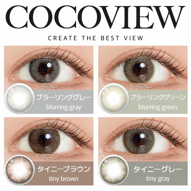 『ココビュー(COCOVIEW)』は韓国で生まれた裸眼風1ヶ月使い捨てマンスリーカラコンです。 自然に馴染みナチュラルでラブリーな瞳になれるブラーリンググレー(blurring gray)&ブラーリンググリーン(blurring green)と、ナチュラルでかなり透明感のある自然な仕上がりのタイニーブラウン(tiny brown)とタイニーグレー(tiny gray)の全4色展開。