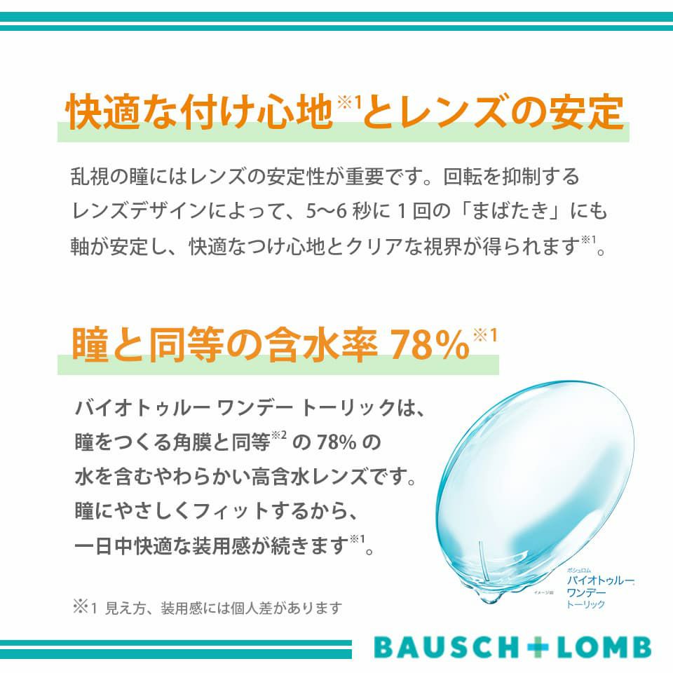 「バイオトゥルー ワンデー トーリック」は乱視用1日使い捨てソフトコンタクトレンズです。使用期限を守り、1日ごとに新しいレンズと交換してください。眼からはずしたレンズは再使用せず、必ず廃棄してください。