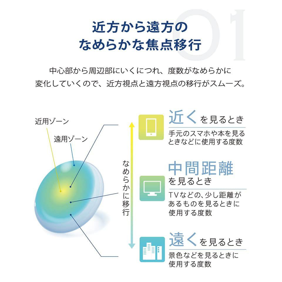 1枚のコンタクトレンズで度数がなめらかに変化する設計なので、手元やスマホなどの【近く】からテレビなどの【中間距離】そして景色などの【遠く】まで視点の移行もスムーズに行えます。お試し5枚入とお得な30枚入りをご用意しております。